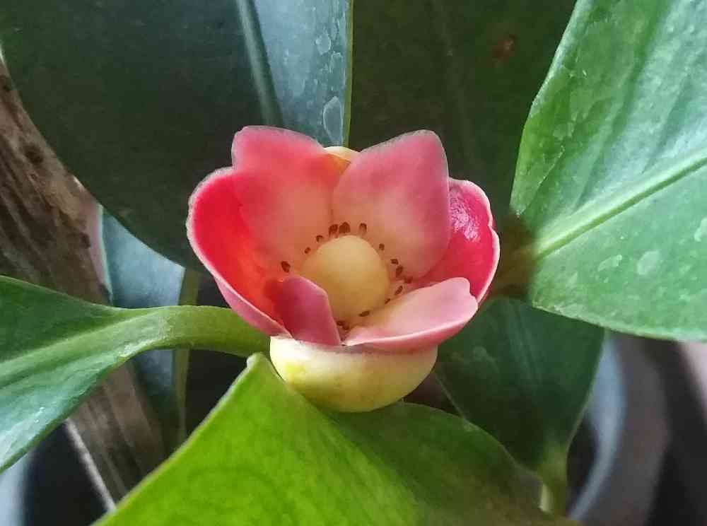 マンゴスチンの花がやっと咲きました。花弁の感じがちょっとツバキっぽい様な。観賞兼用になりそう。