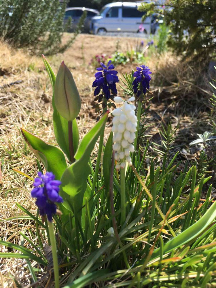 植えた覚えがないムスカリとチューリップが並んで咲いてきました。多分植えたんでしょうけど、1年経つと忘れてしまうみたいです。