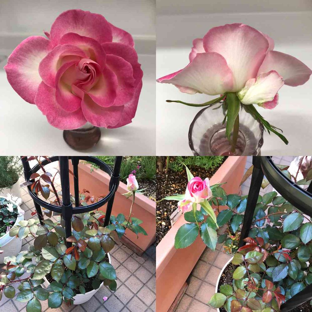郊外の園芸店で何気なく購入して、テラスに置いていたら、どんどん成長するので、オベリスクに仕立てましたが、名前がわからないのと、つるバラなのか、詳しくないのでどなたか教えてください。ずっと蕾が開かず、寒さも続いたので摘み取って部屋で挿していたら、大輪の花が咲きました!香りはそれほどありません。