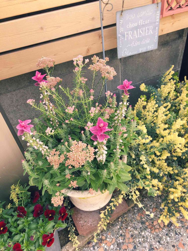 春の寄せ植えです。色違いのライスフラワーを使ってピンクのグラデーションです。