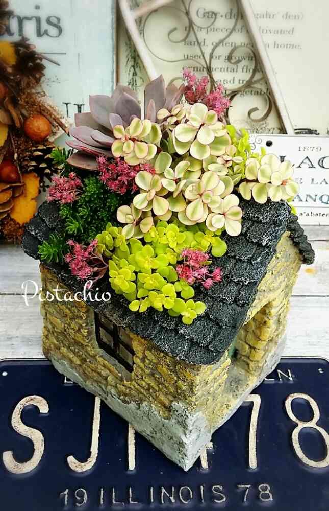 さん、はじめまして❤このお家は有名なモルタル作家さんがデザインされた市販のレジン製の植木鉢で、園芸店で販売しております。私が作った手作りのモルタルハウスもこちらに写真を投稿してますので、宜しければ私の名前部分をタッチ頂けたら、作品を見て頂けます♪