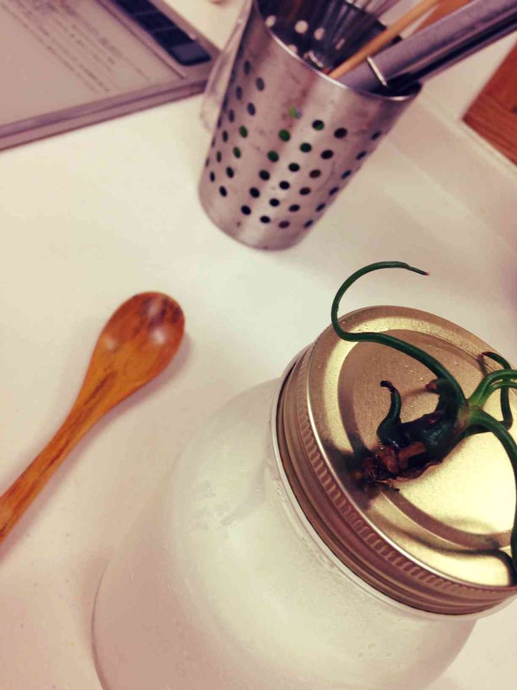 カスピ海ヨーグルトを作る時間に、たね菌の蓋をあけようとしてくれたエアープランツさん。