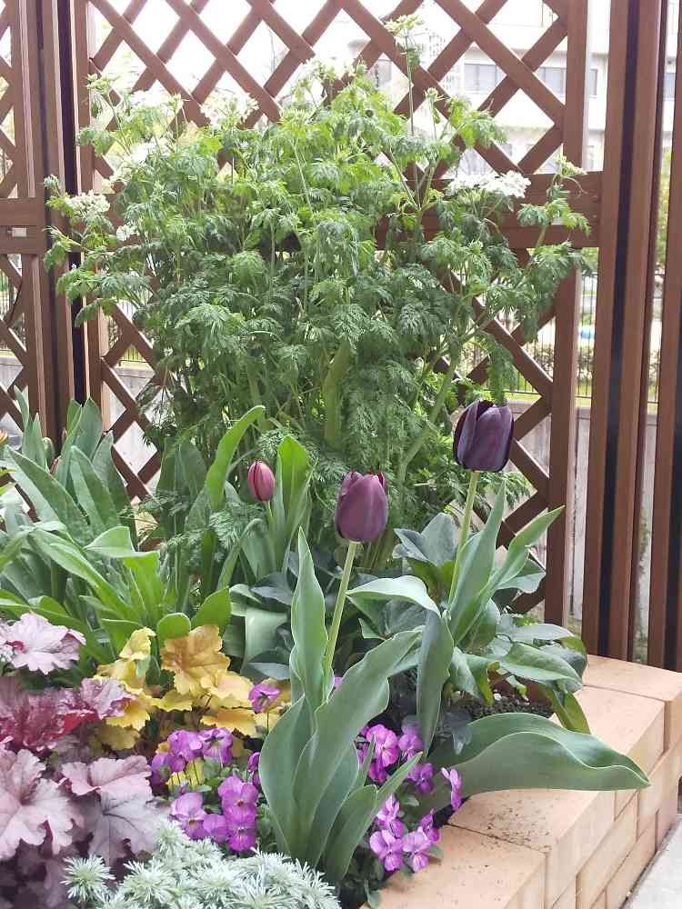 オルレアの近くにチューリップカフェノアールを5球植えているのと、もうちょいオルレアの花数が増えたら変わってくるかもです💜