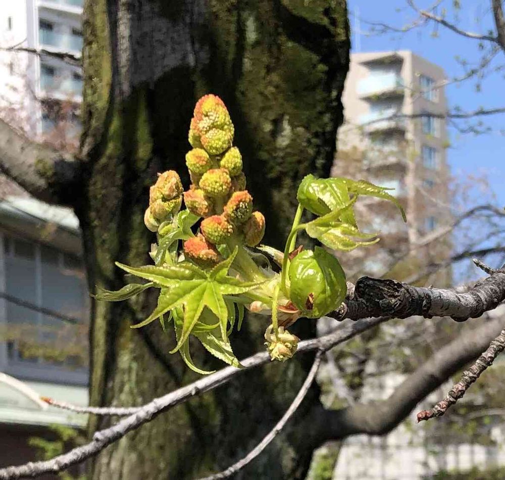 WHO?と思って調べたら、モミジバフウの花でした。紅葉🍁がキレイな花の色づき…