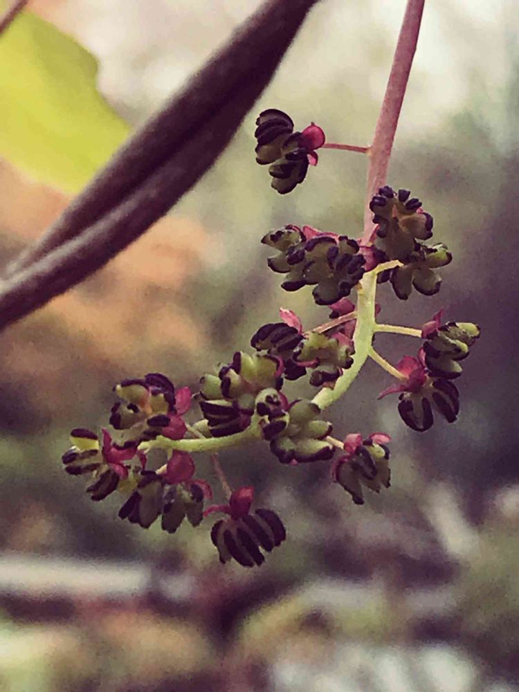 庭に勝手に生えているミツバアケビの花が咲いていました。