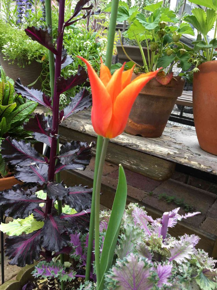 素晴らしくスレンダーなチューリップ🌷 バレリーナさんです。となりにあるのは葉牡丹ミツコ、花が咲いています。タネ取りするため、しばらく放置😁