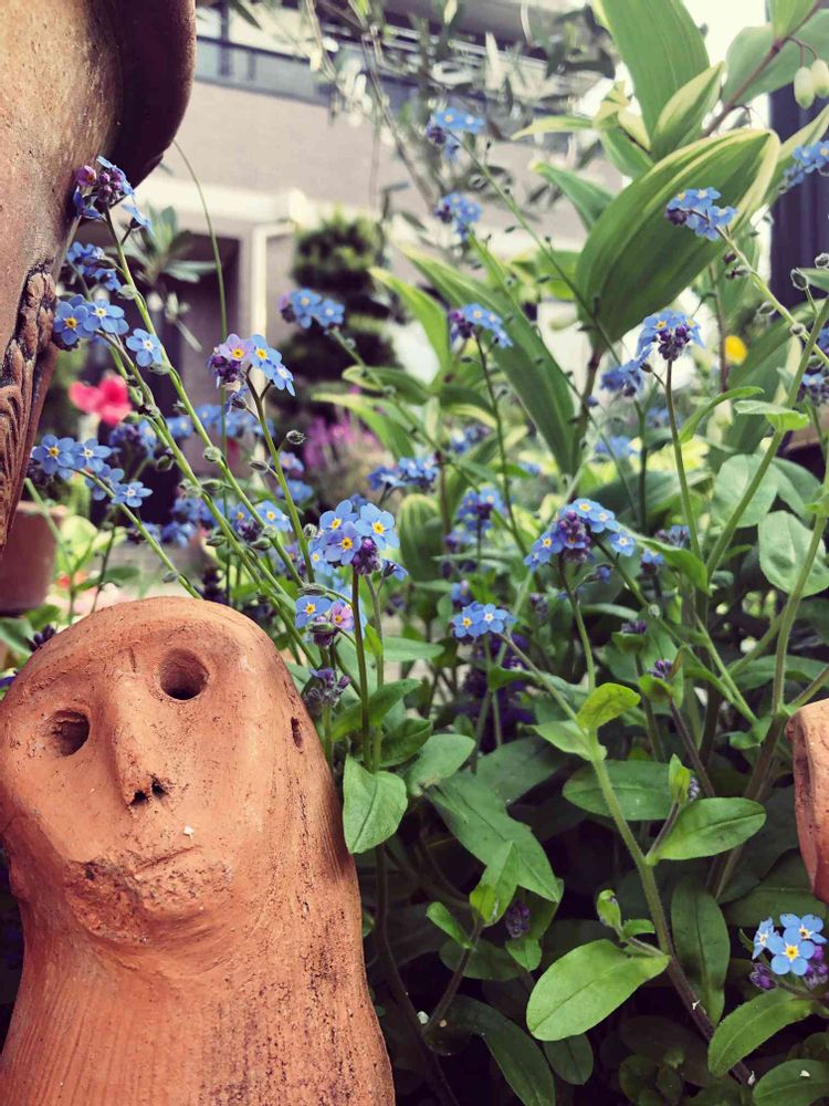 毎年てんとばえする(九州の方言で、こぼれ種で生えること😁)忘れな草。ゴミ置き場から連れてきたサルの埴輪レプリカと一緒にパチリ✨
