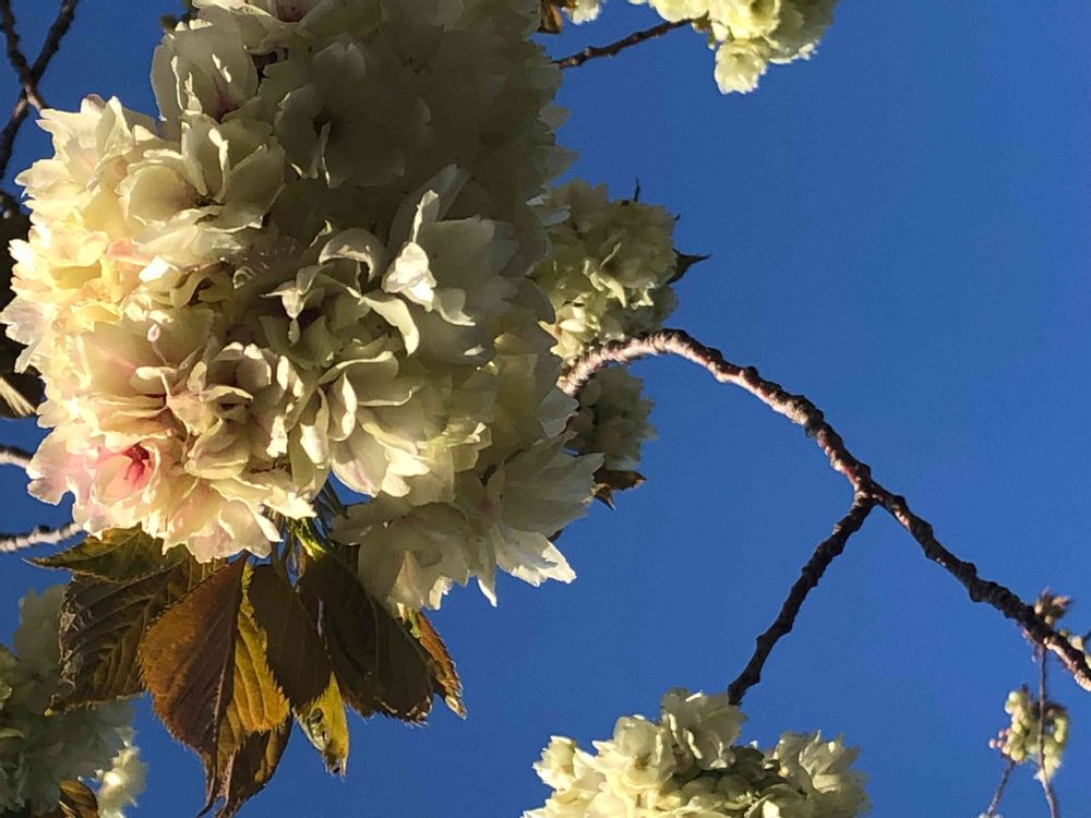 桜の種類だと思いますが、まとまった花のかたまりがアチコチに咲いています。なんか実がなるのかな?