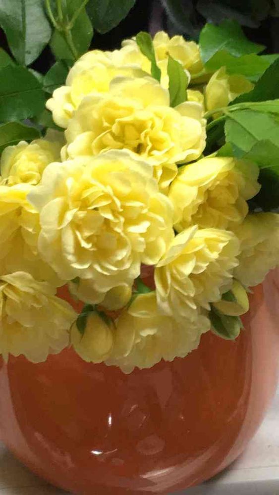 沢山の黄モッコウバラさんを少しカット✂️してオレンジ色のマグカップに生けてみました😃🎶