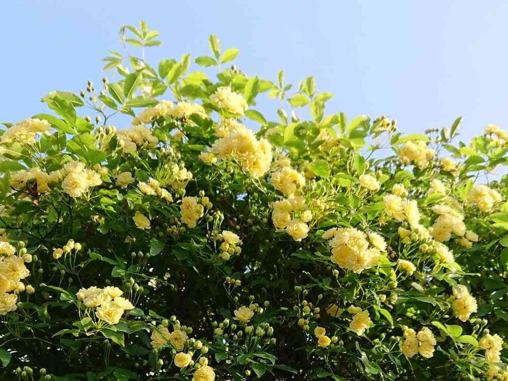 ご近所のモッコウバラ 一階の屋根を埋め尽くし、二階の窓まで届いています