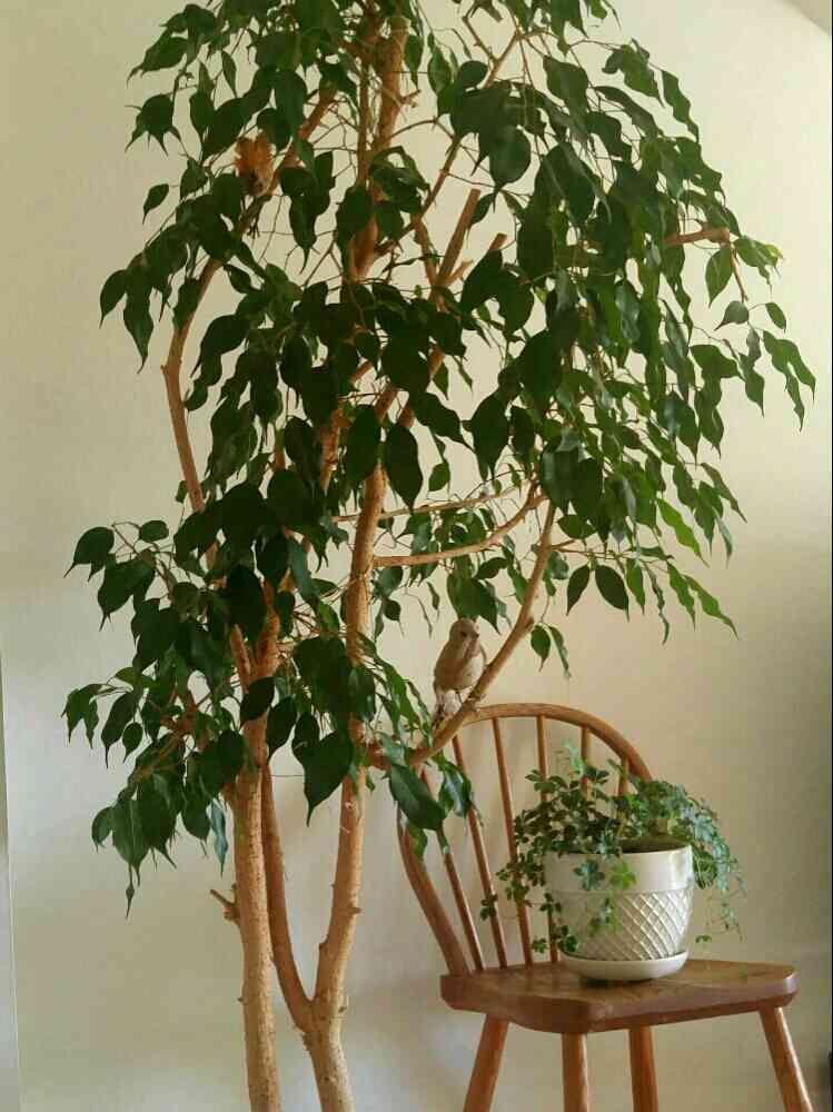 シンボルツリーのフィカスの横に椅子を置いて、木陰をイメージしました。枝にフェイクの鳥がとまって休んでいるイメージで。
