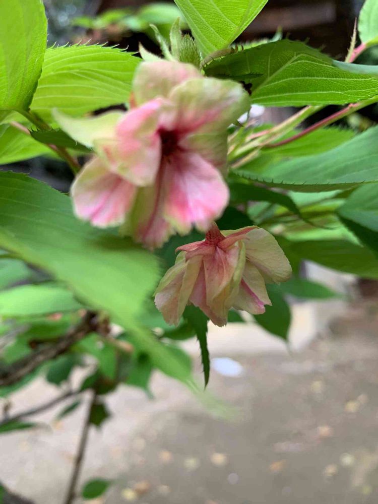 初めはウコンのように黄色で、その後ピンクに変わるそうです。私の背丈ほどの木でした。しかし若木ではなく、老木でした。来年は咲き始めてから色が変わる様子を見学します。