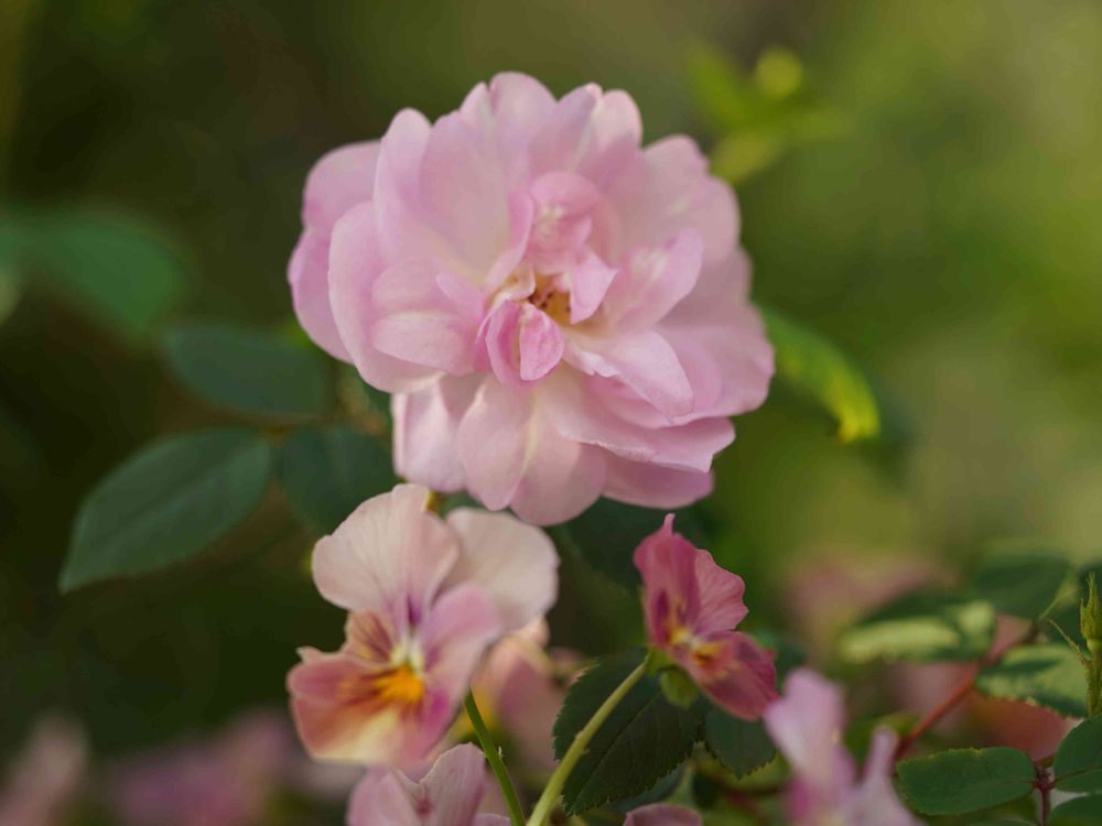 バラさんの花色に合わせて桃色のビオラさんとコラボレーションしてみました( ˶ˆ꒳ˆ˵ )