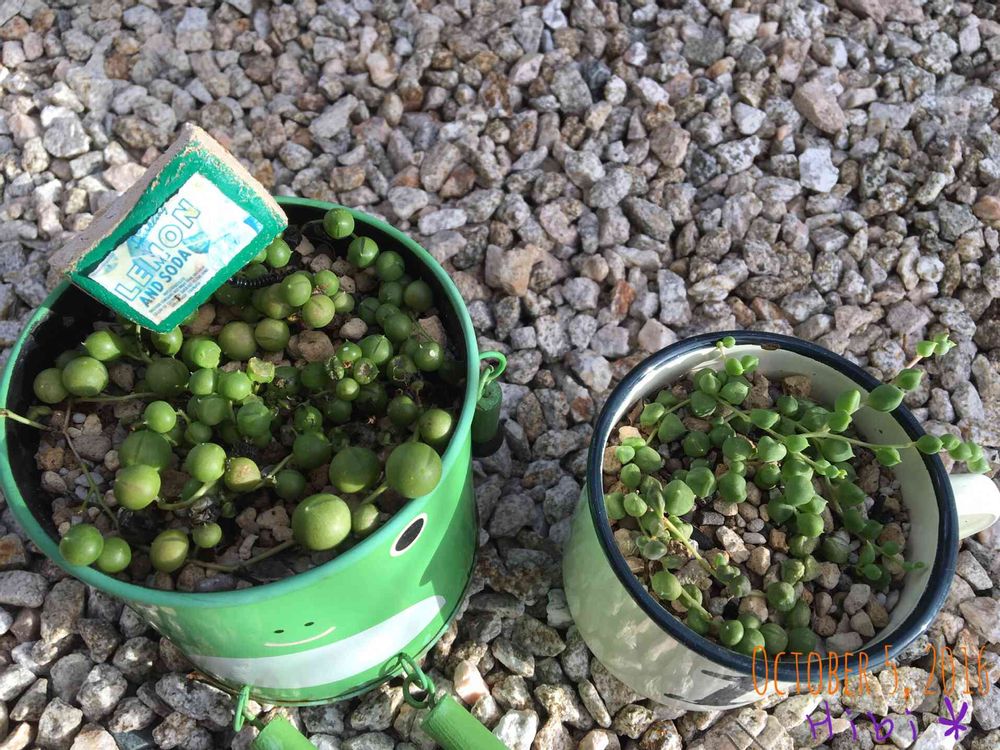 左のカエルのブリキ鉢のほうは最近見たらオンブバッタがついちょって見てたらえらいたくさん粒をお食べになってたのでせっかくも新芽が出ていたのにもう悔しくて悔しくて最近はみかけたら御免‼︎と思いながらやっつけてます💦多肉ちゃんやら植物を守る為じゃ、しゃーない😭最近リプサリスにもアオムシがついてたりチラホラ虫被害がでてます😱見つけたら御免‼︎容赦せん‼︎
