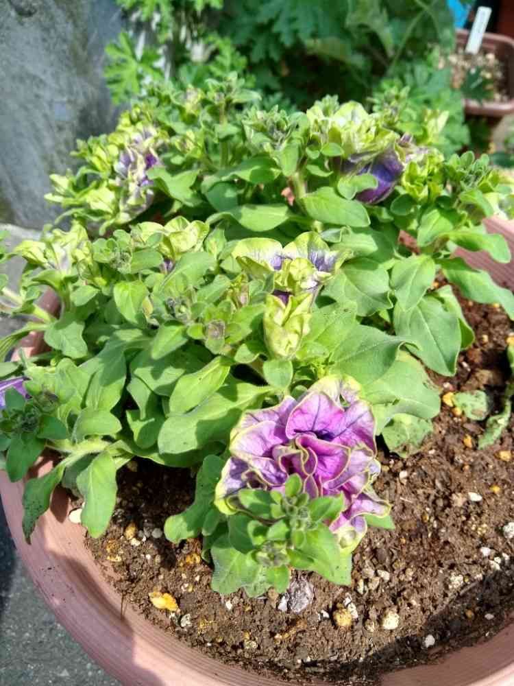八重咲きペチュニア、湘南ヴィオーレヴェルデを鉢に植えました。