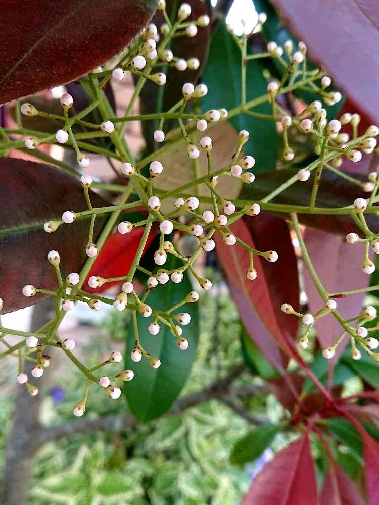 我が家の庭の垣根にしているベニカナメモチに蕾が付きました🎶