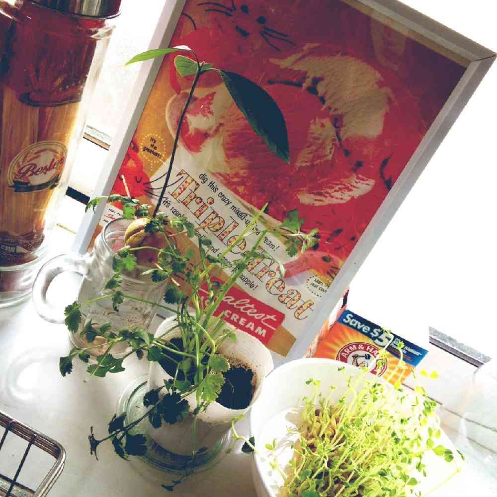 種を水に浸けておいたら発芽したアボカドはすっかり観葉植物となり、パクチーはあっという間に食べられてスカスカ、豆苗は当然発芽させてリサイクルです(*^^*)