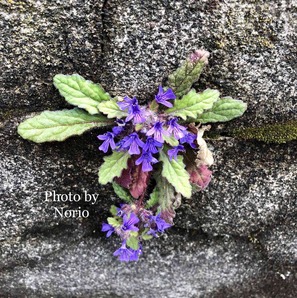 キランソウです。普通は地面に張り付くように咲くのですが、これはコンクリートの壁の割れ目から垂れ下がるように咲いてました😄紫色の花がキレイですね☺️