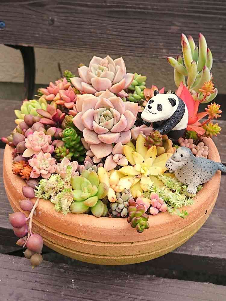 流石!寄せ植え上手!!中央の真っ黄色の子は何ですか?紅葉している状態?? しゃくれパンダにしゃくれアザラシ、可愛くて笑える((((((≧∇≦))))))