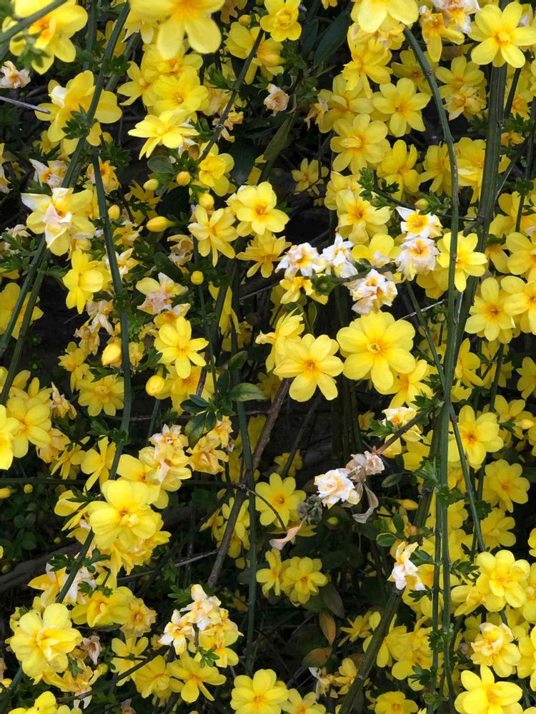 葉が新芽のようで常緑ではないようなので、オウバイ(黄梅)の八重咲き品種かも。常緑ならウンナンオウバイ(雲南黄梅)