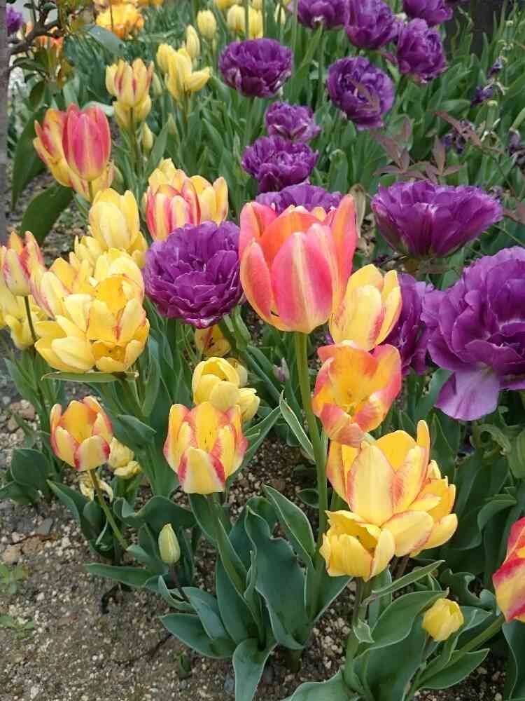 去年のチューリップ🌷より狭い間隔で植えてみたら、以外と八重咲や1本の枝から三つの蕾❕とゴージャスなのが多くて、凄くボリュームが出ました😆🎶⤴