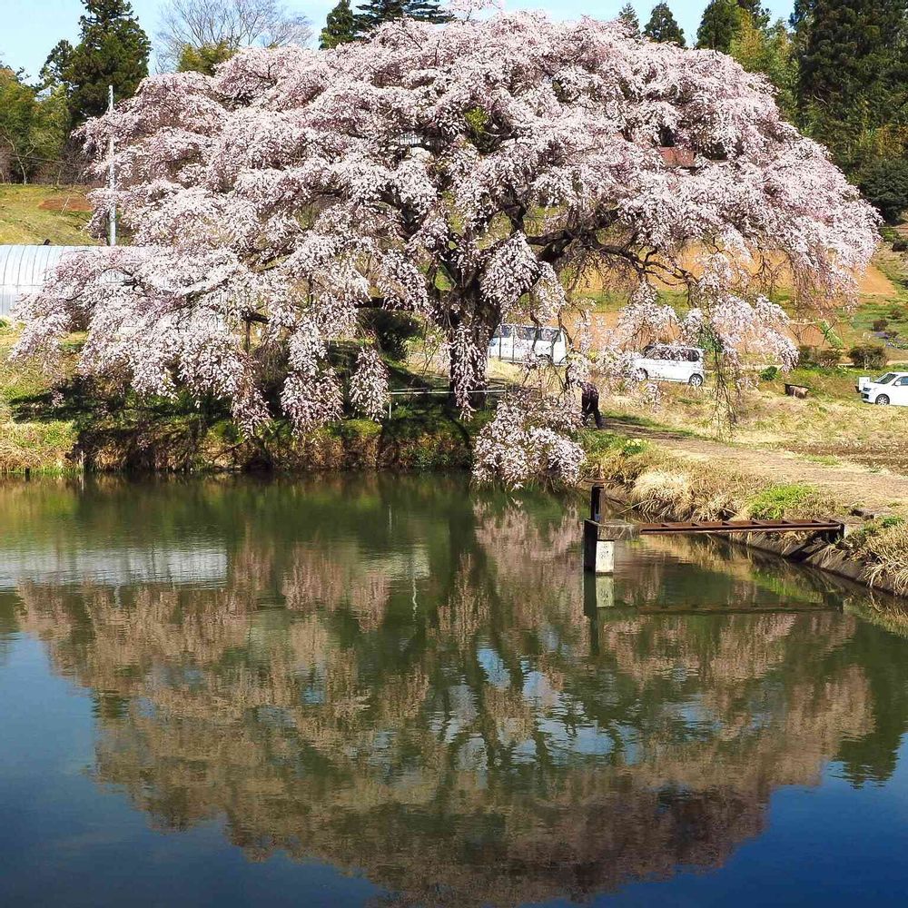 福島市の芳水の桜🌸です。早朝に来たらもう少し水面が静かだったのに残念です。