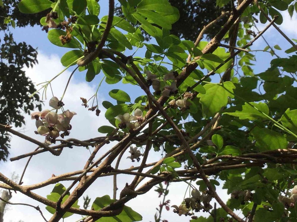 五つ葉アケビと三つ葉のアケビが絡み合いながら花をさかせています。