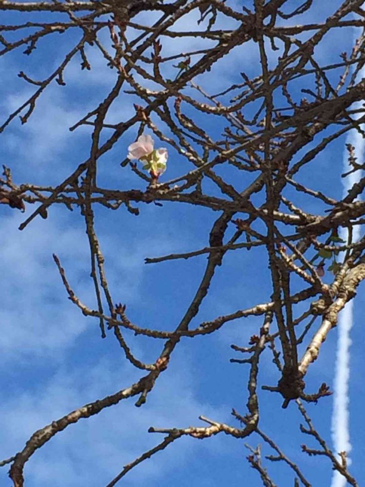 葉を落とした枝に桜の花が一輪🌸