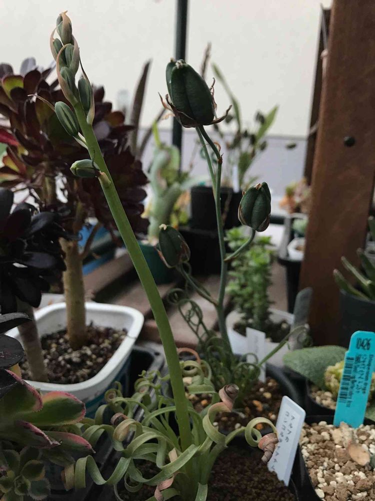 アルブカ・コンコルディアナが開花間近。スピラリスやヴィスコーサが開花して実ができた頃に花芽が見えて、最近ようやく上昇。タネが取れるのは五月か六月か?自家採種のタネは発芽率も高いので今から期待です。