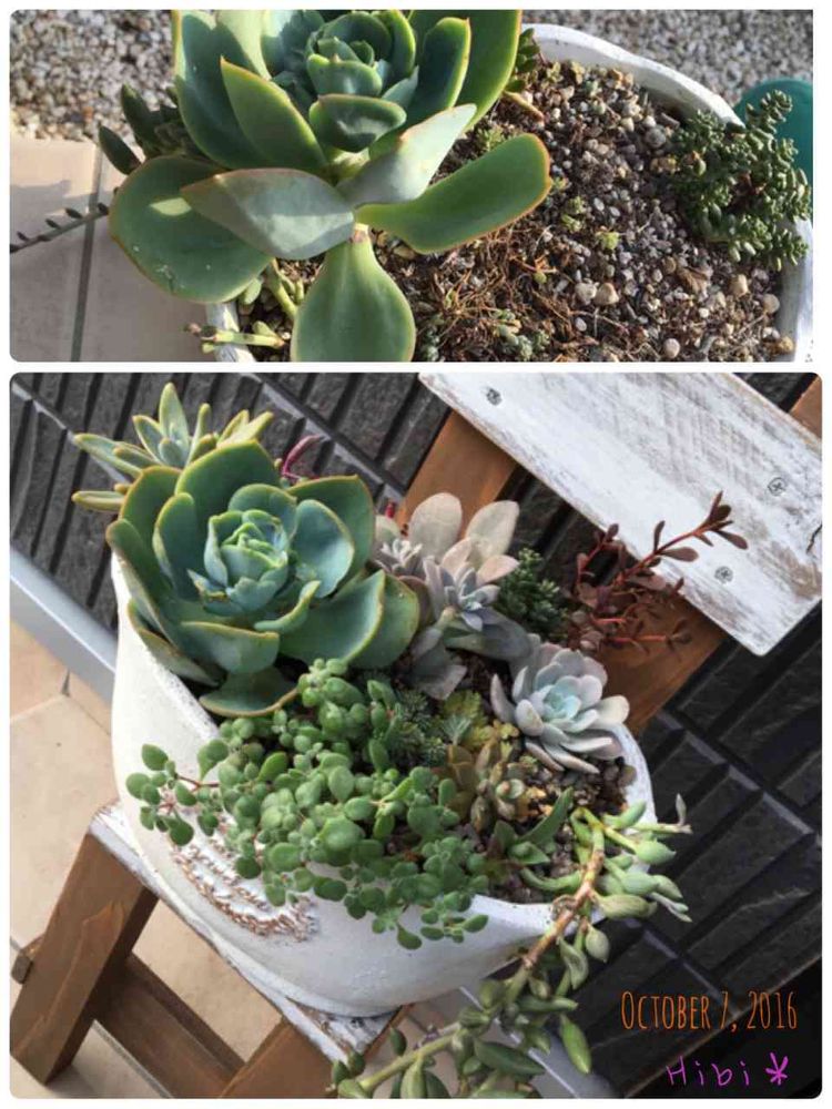 下がAfter、なんかまとまりが悪いけれどうちの中では一番たくさんの多肉ちゃんが植え付けられてるだろう鉢になりました。