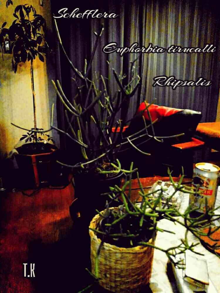 帰宅後 早々に植物達に水やりして、ミルクブッシュとリプサリス 似たもの同姿 傍に置いて くつろいでます✌