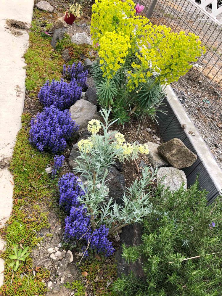 アジュガ地植え。植え付けから1年で大きくなってくれました。満開ありがとう…