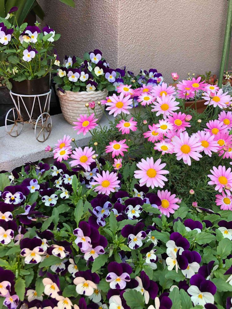 クールな色のビオラと、可愛いピンクのマーガレットが引き立て合っていますね🌸😊