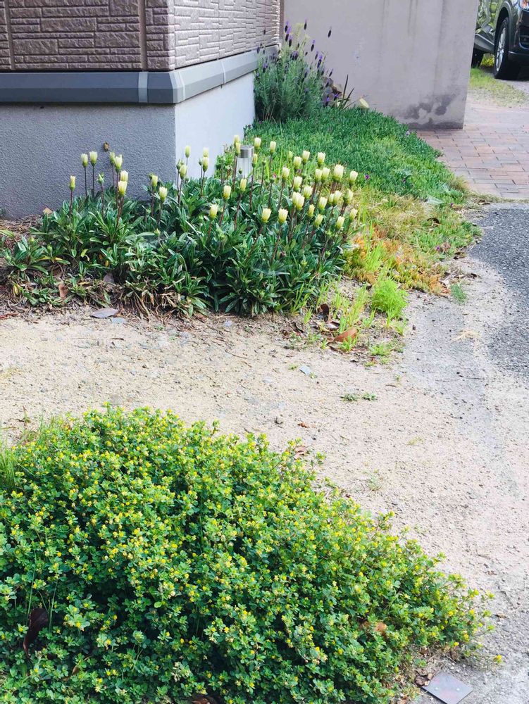 手前から、勝手に生えてきたけれどとてもいい感じにこんもり茂っているコメツブツメクサ、ガザニア、マツバギク、満開のフレンチラベンダー、建築中のユーフォルビアミニロックガーデン😊