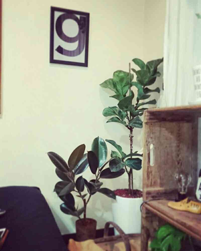 リビングの一角。カシワバゴムの木と、フィカスバーガンディ。