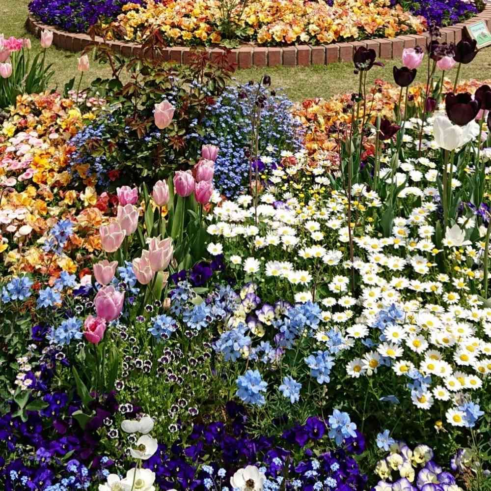 チューリップ、パンジー、ビオラ、ネモフィラ、ラナキュラスが、所狭しとうえられており、まるで、黄泉の国の、花園、そんな気になります!!。