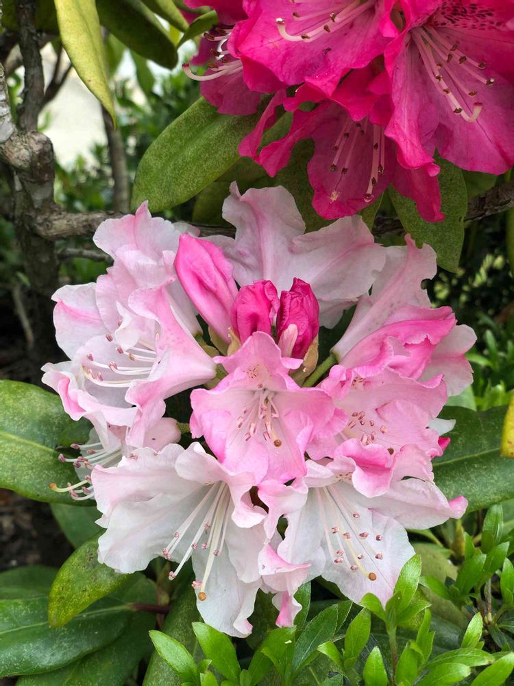 蕾は紅く、開花と共にピンク〜白のグラデーションが非常に美しく、強健な西洋シャクナゲです。