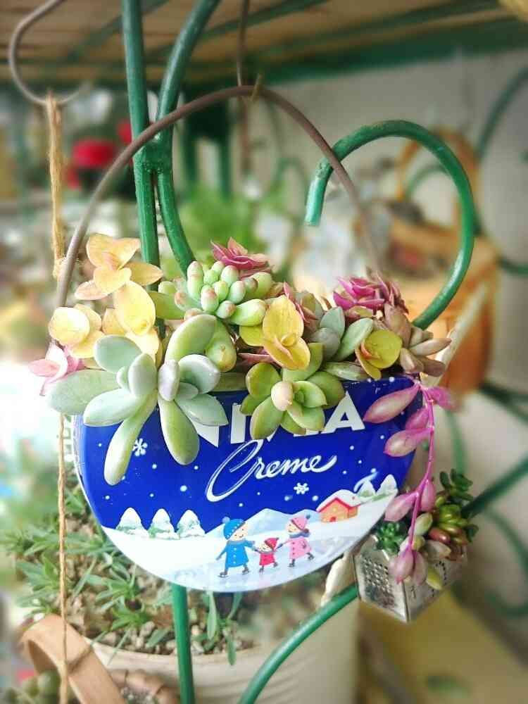 さん、ニベアの青缶、かわいくて大好きです(´∀`♡)♬どうしても多肉さんとコラボさせたくて、ハンギングタイプにしてみましたﻌﻌﻌ♥︎