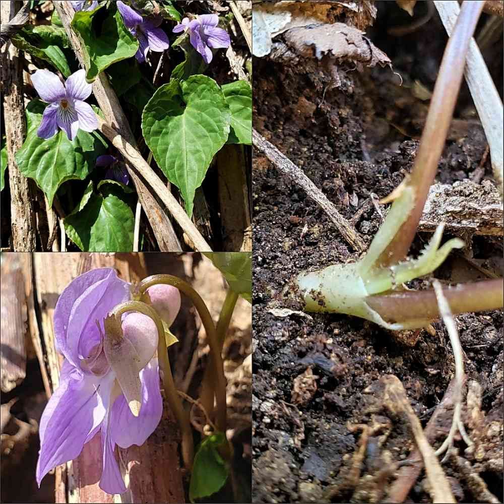 地面を少し掘ってみたら、合着した托葉が現れて(右の写真)、これがスミレサイシンの仲間の特徴らしい。
