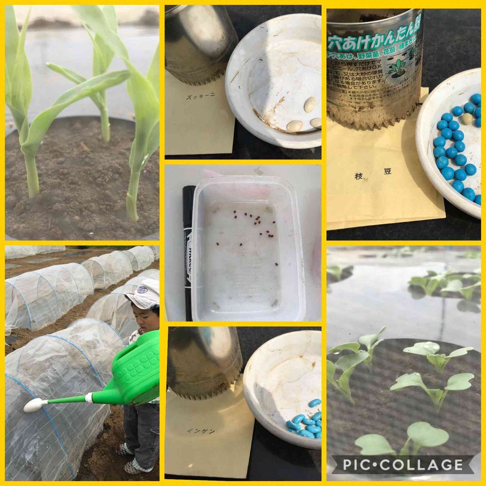 4月の2週目にまいた種とうもろこし🌽や小松菜🥬大根、かぶなどはもう芽が出てきています。