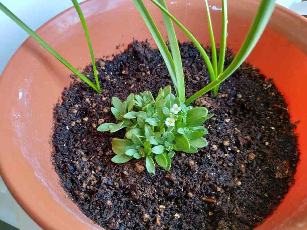 こぼれ種から芽が出たアリッサムがスイセンの鉢を侵食し始めました(*^-^*;)