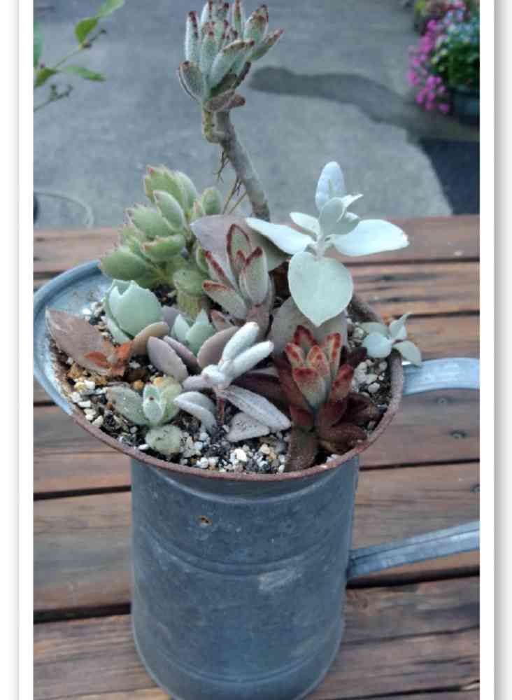 昨日作った寄せ植えで多肉心に火🔥がついてしまい、ブリキのミルクポットに、毛布のようなモフモフの多肉植物だけを集めて植えてみました