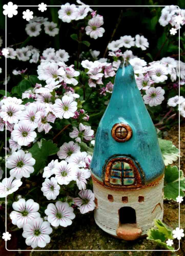 深い青緑の屋根とお花の白が、