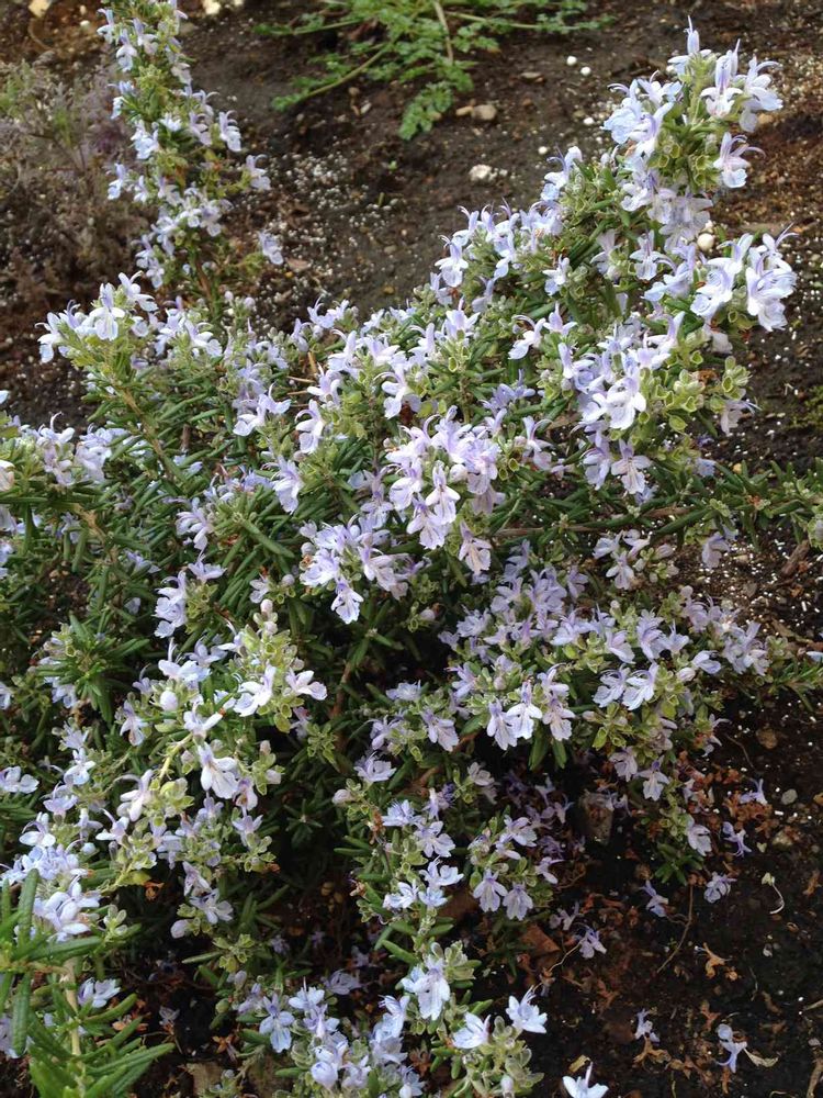 二、三年前に我が家にも東向きの花壇に何となく花付きにもよいかなぁ?と思って、3種類のローズマリー苗木を三角形の配置で植えたのですが、苗木はすくすく成長したのですが、現在のところ、我が家のローズマリーたちの花付きは非常に悪いです😅💦