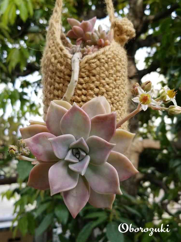 4月2日に投稿した編み編みカバーに収まった朧月にお花が咲きました
