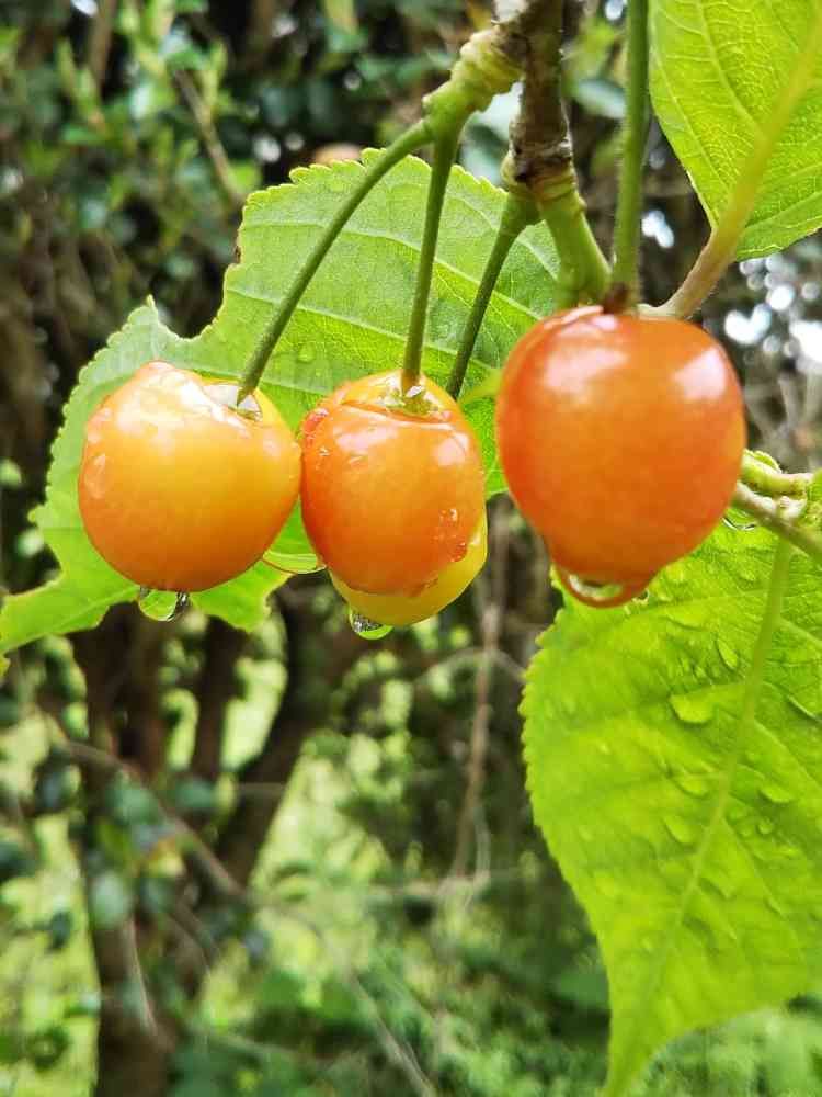 雨がやんで外にでると、さくらんぼ🍒が色づきはじめましたよ~😁