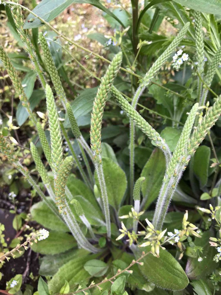 ニョロニョロはツボミオオバコ、右下の細長い毛の生えたツボミのような白い花はミミナグサの一種、左下の小さな薄い青の小さな花をたくさんつけているのはキュウリグサだと思います