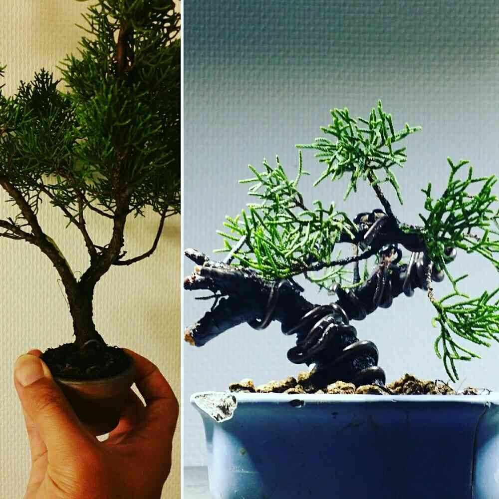 初めての真柏 。盆栽大野さんで棚の隅に追いやられていたモノをエイやっと曲げて使い古しの割れ鉢に入れてみました。結構幹も太くなっていたので、ポキっという音も聞こえたような聞こえないような。左側は ジン にする予定です。
