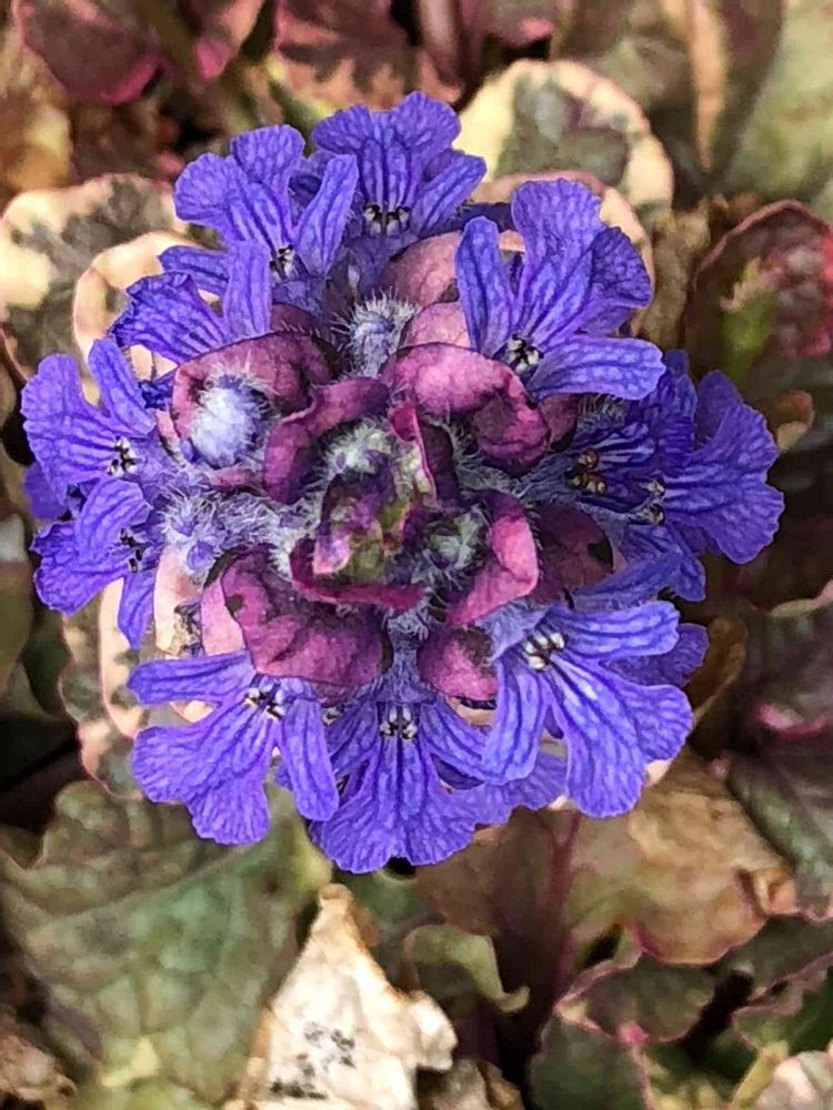 アジュガは横から見た姿はたくさん見かけますよね😊上から見たら花びらがぐるっと丸く見えてかわいい😍アップにしたら 花びらの模様も綺麗💕