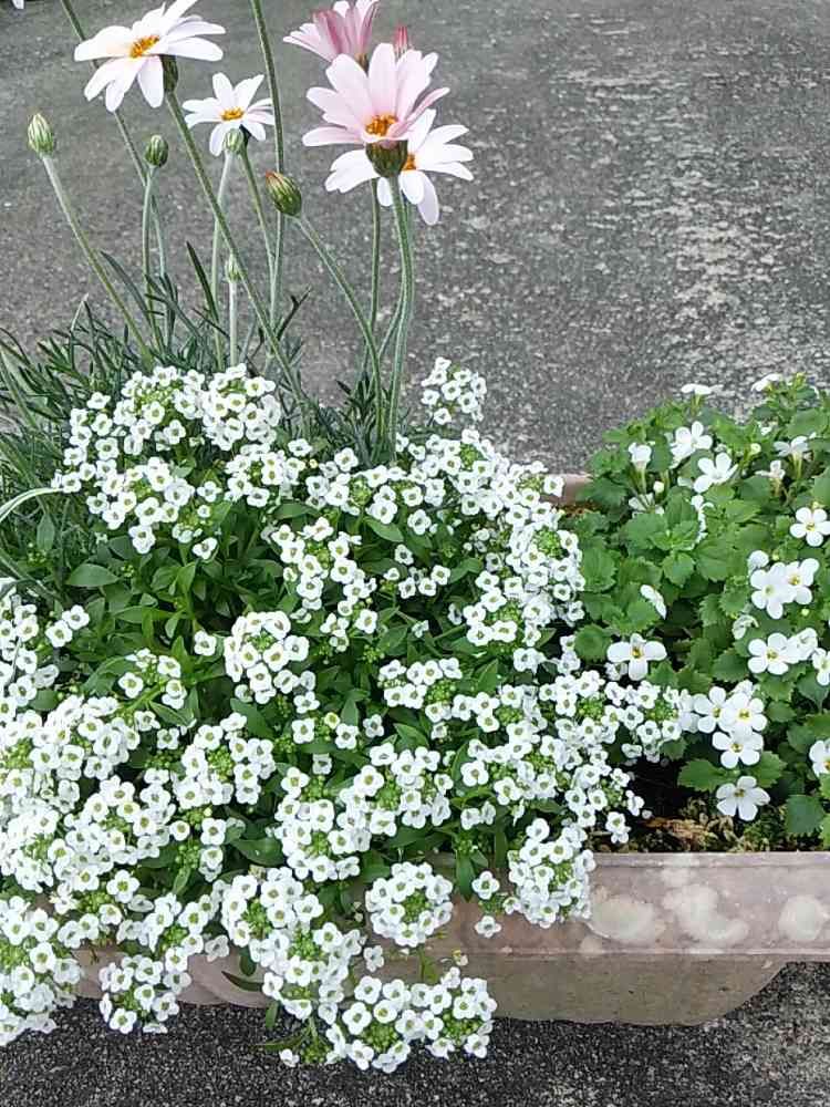 ポット半分に分けた、普通のスイートアリッサムが